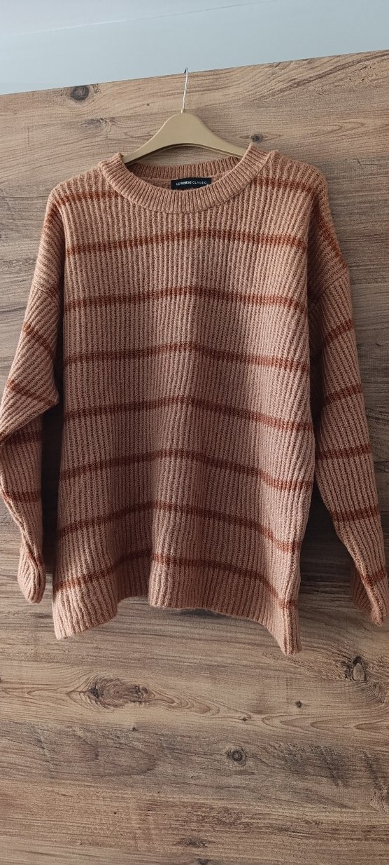 Kadın kahverengi örgü kazak, uzun kollu ve salaş kesimlidir. Yuvarlak yakalı, normal midi boyunda, rahat sokak stili için uygundur.