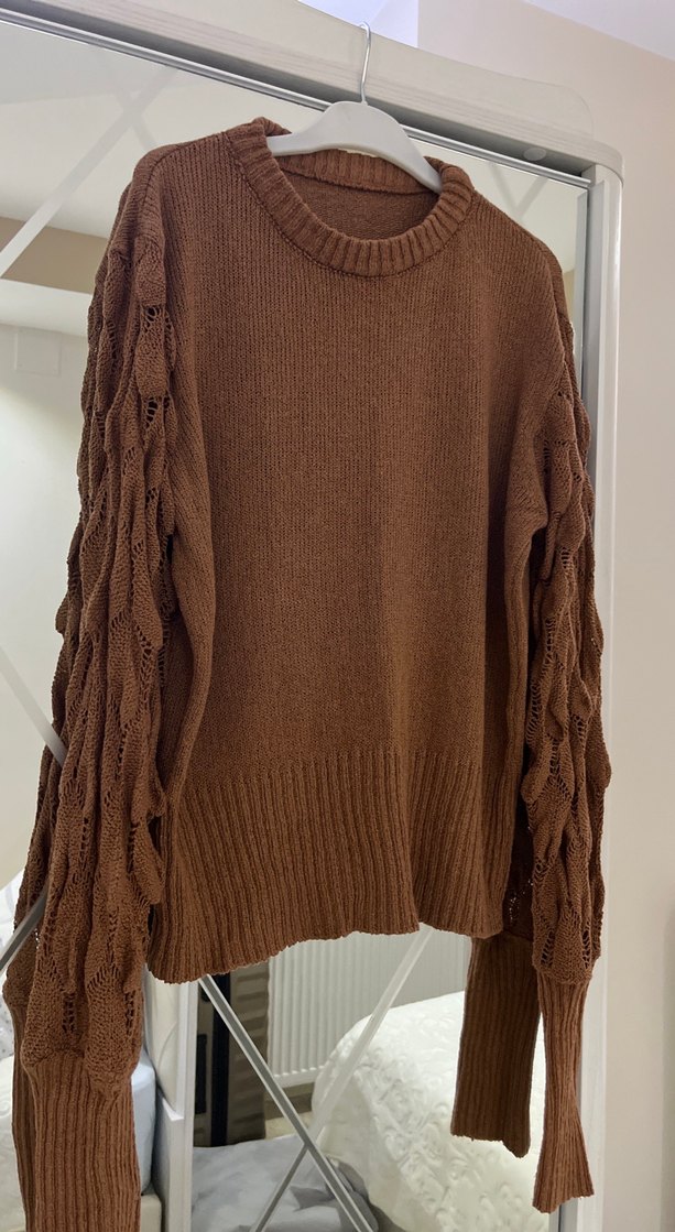 Kahverengi, yuvarlak yakalı ve uzun kollu örgü kazak, salaş kesimi ve rahat dokusuyla günlük kullanım için uygundur.