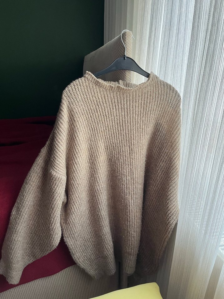 Kahverengi, yuvarlak yaka, uzun kollu, örgü salaş kazak. Günlük rahat kullanım için uygundur.