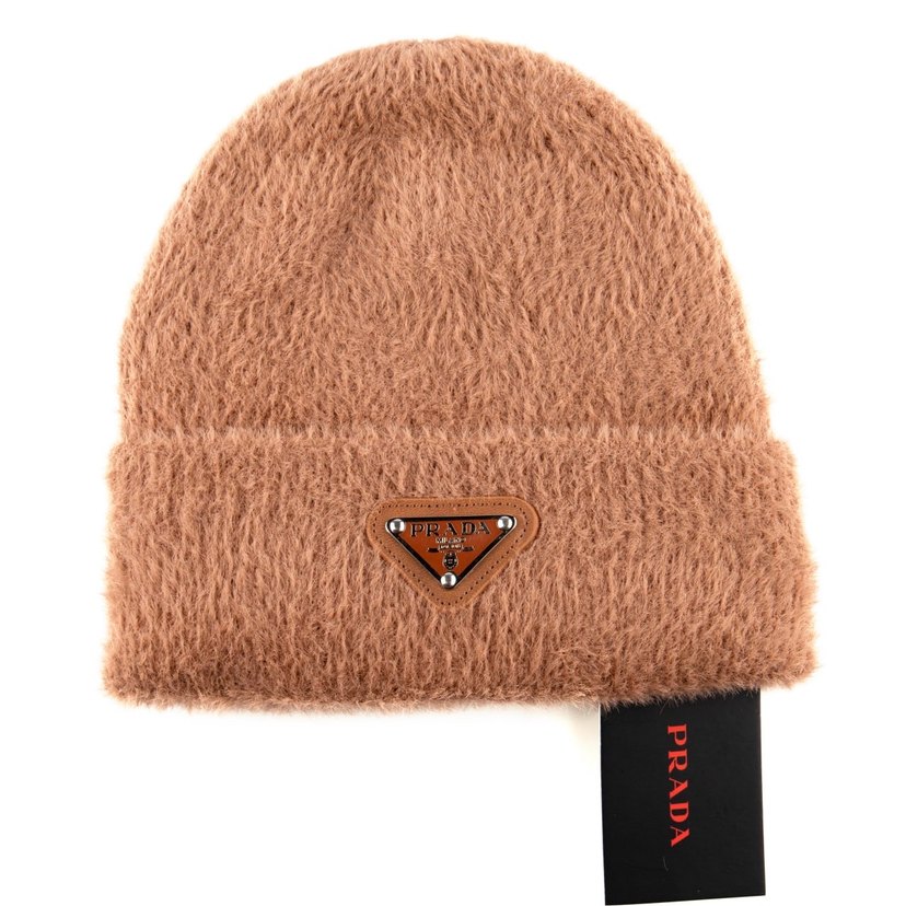 Yumuşak ve sıcak dokulu kahverengi örgü bere, PRADA logosu ile sade ve rahat sokak stili için uygundur.