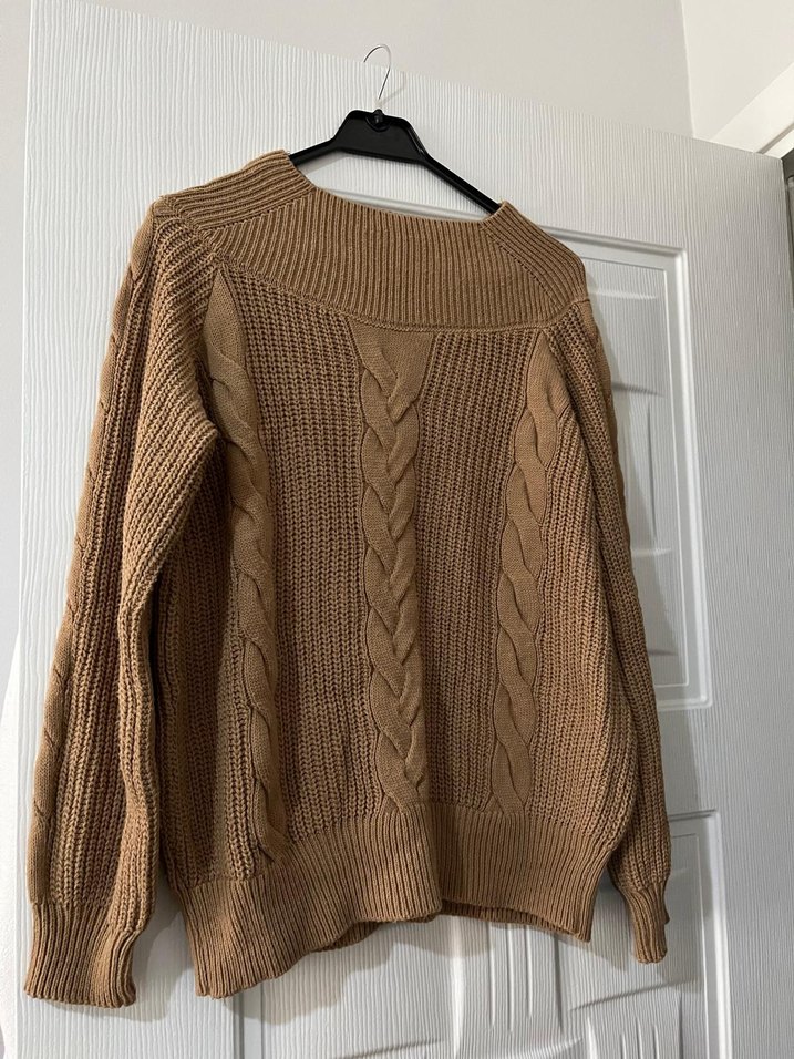 Kadın kahverengi örgü triko kazak, rahat kesim, yuvarlak yaka ve uzun kolludur. Yumuşak örgü kumaştan yapılmış, bohem tarzıyla günlük kullanıma uygundur.