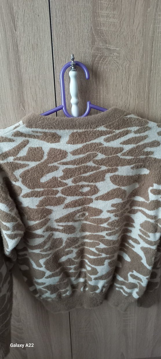 Bu kadın kahverengi örgü triko kazak, bol kesim, uzun kollu ve yuvarlak yakalıdır. Yumuşak örgü kumaştan yapılmış olup, kahverengi ve gri soyut desenler içerir, günlük sokak modasına uygundur.