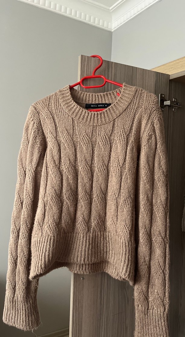 Yumuşak örgüden yapılmış, yuvarlak yakalı ve uzun kollu kahverengi, bol kesim triko kazak. Günlük rahat kullanım için uygundur.