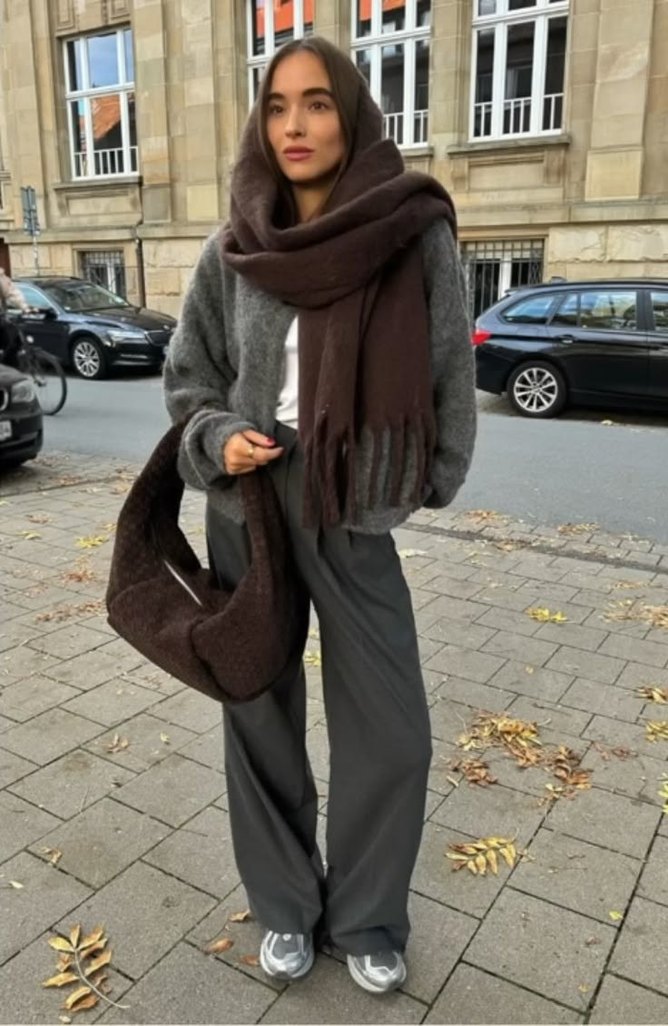 Kadınlar için örgü akrilik atkı, kahvrerengi renkte yumuşak ve sıcak tutar. Sokak stiline uygun, rahat ve şık bir parça.