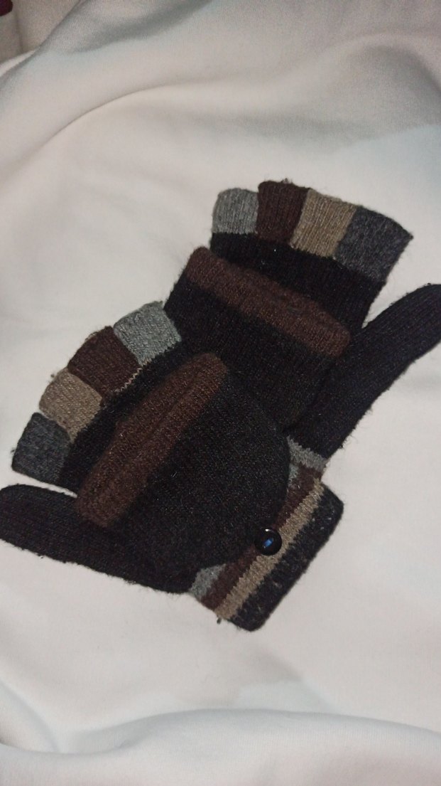Koyu kahverengi örgü yünden yapılmış, parmakları açık kadın eldiveni.