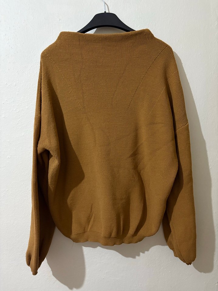 Kadın kahverengi örgü yün kazak, yuvarlak yaka ve uzun kolludur. Bol kesimi ve sade tasarımıyla günlük kullanıma uygundur. Rahat ve sıcak bir dokusuyla sokak stiline uygundur.