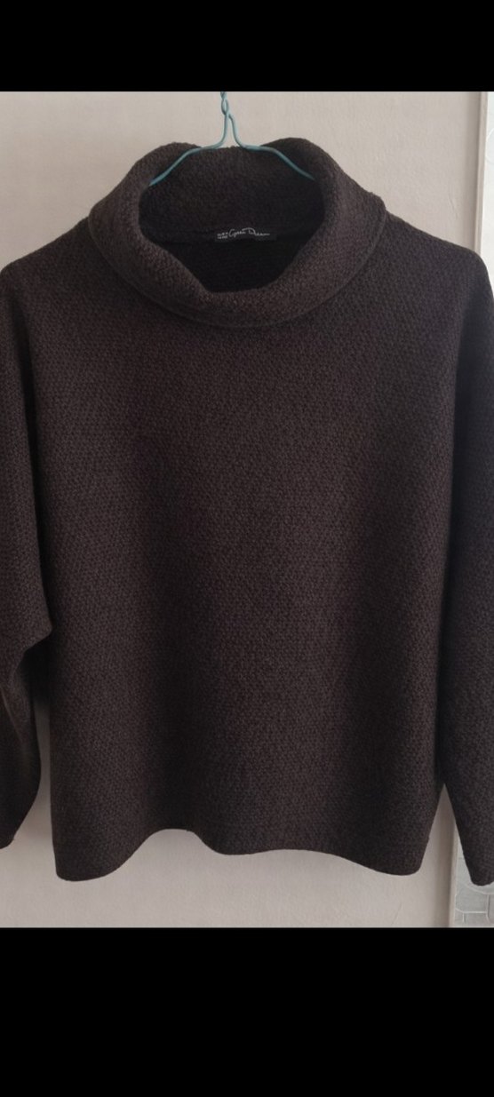 Geniş kesim, kahverengi örgü yün kazak, yuvarlak yaka ve uzun kollu, günlük kullanıma uygun rahat ve sade stil sunar.
