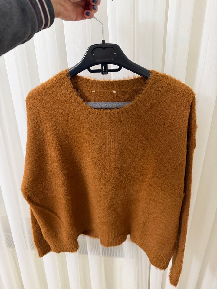 Kadın kahverengi örgü yün kazak, yuvarlak yaka ve uzun kolludur. Rahat kesimi ve normal boyuyla gündelik kullanıma uygundur.