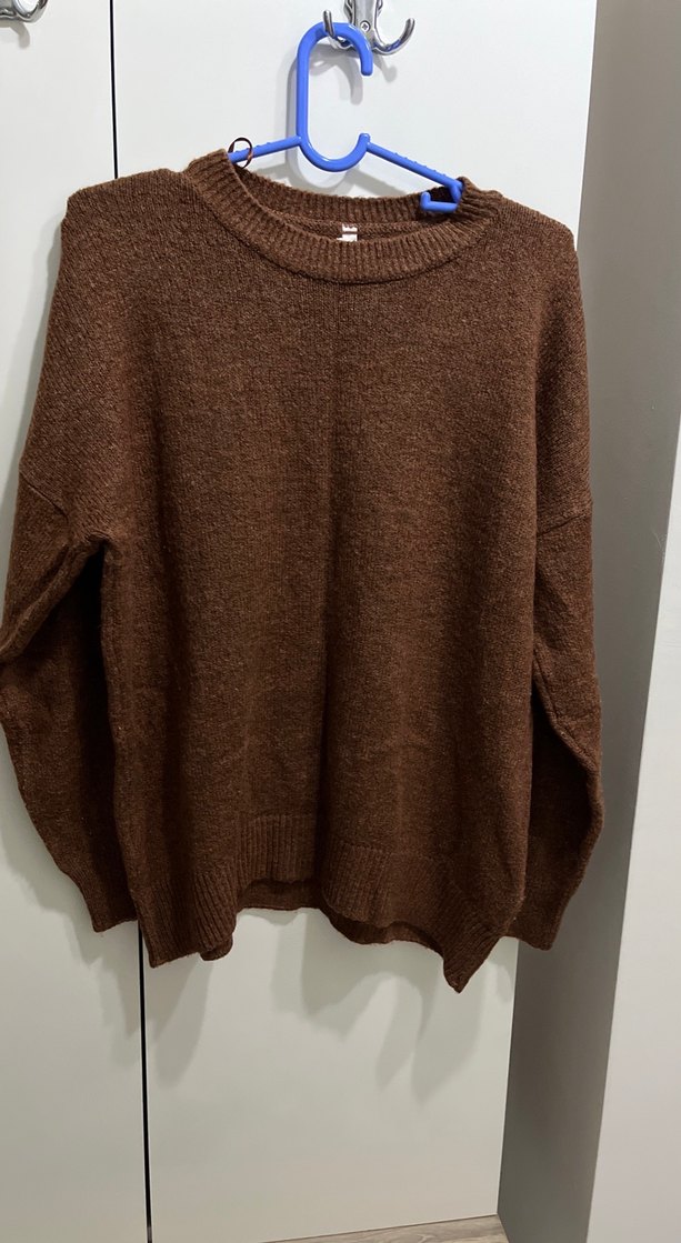 Kahverengi örgü yünden, yuvarlak yakalı ve uzun kollu, rahat kesim normal boy kadın kazak.