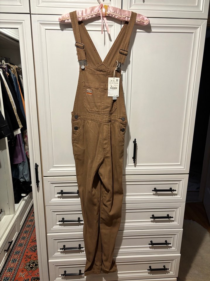 Kahverengi pamuklu uzun tulum, tokalı askılar ve bol kesimle vintage sokak tarzı sunar. Notch yaka detaylı, günlük kullanıma uygun.