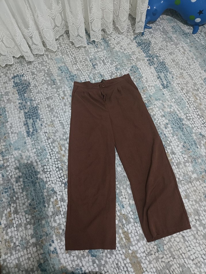 Kahverengi pamuklu, bol kesim, midi boy kumaş pantolon. Günlük kullanıma uygun, rahat ve şık bir seçim.