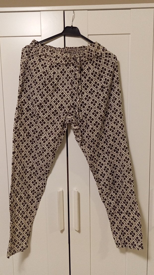 Yumuşak pamuk kumaştan, kahverengi batik desenli, bol kesim ve kemerli kadın pantolonu. Rahat ve bohem tarzda.