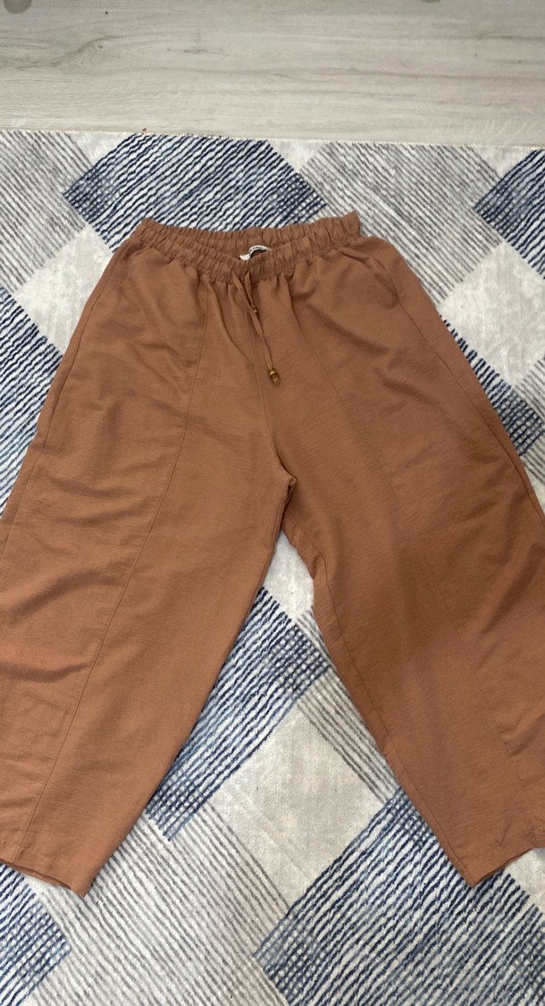 Kadın kahverengi pamuklu pantolon, rahat kesim ve midi boy ile günlük kullanıma uygun, zahmetsiz şıklık sunar. Trendy casual ve street tarzları için ideal.