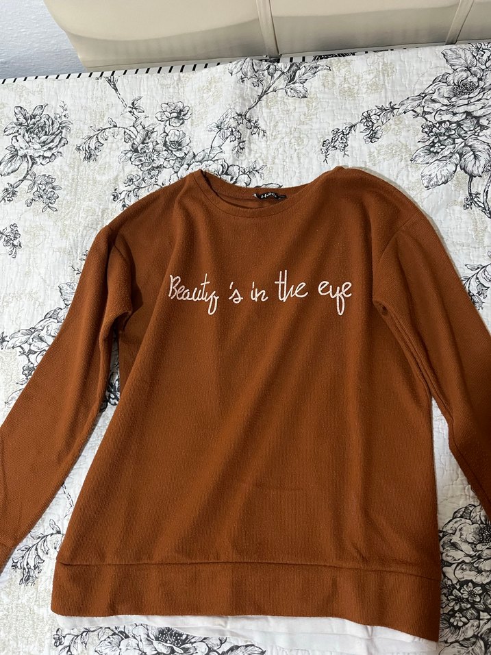 Kadınlar için koyu kahverengi, pamuklu, örme, bol kesim sweatshirt. Uzun kollu ve yuvarlak yakalı, "Beauty's in the eye" baskılı. Günlük rahat stil için uygun.