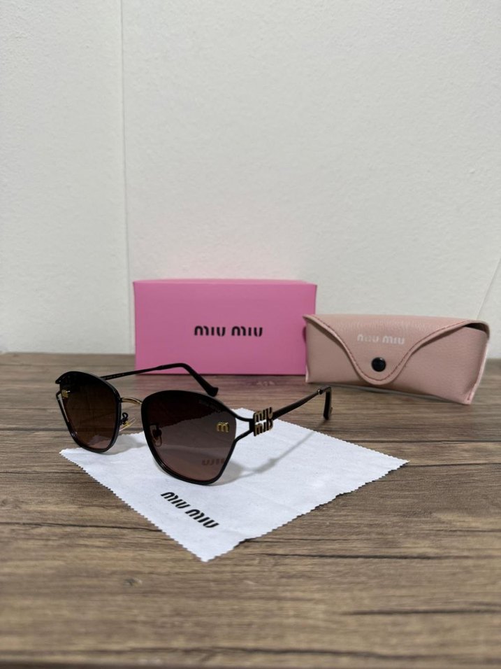 Minimalist tarzda, kahverengi parlak Miu Miu güneş gözlüğü. Koyu renk camlı, şık ve günlük kullanıma uygun. Kılıf ve temizleme bezi ile birlikte.