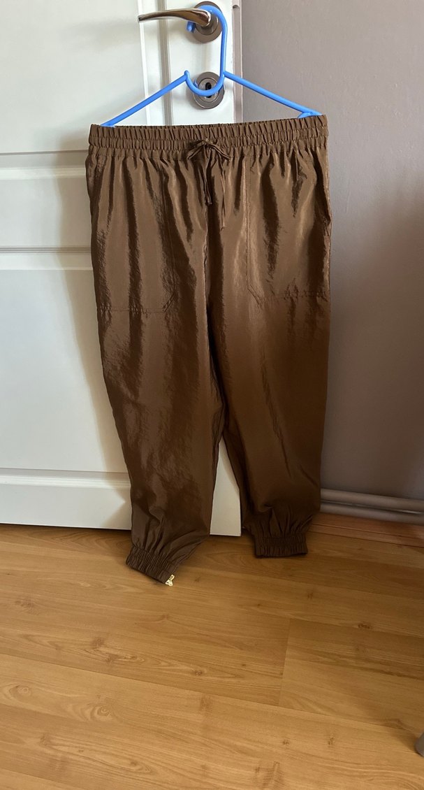 Kahverengi, parlak ve ipeksi dokulu pilili bol kesim pantolon. Lastikli bel ve paçalar, rahat sokak tarzı için uygundur.