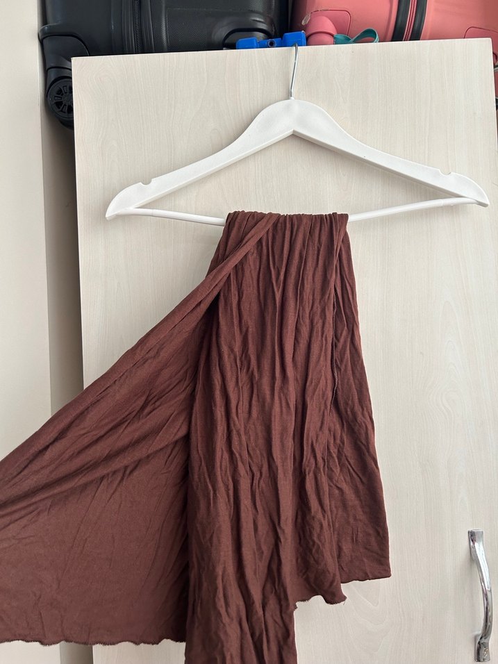 Kadınlar için kahverengi keten kumaştan, drapeli şal. Minimalist ve bohem tarzları birleştirir, sade ve temel görünümlüdür.