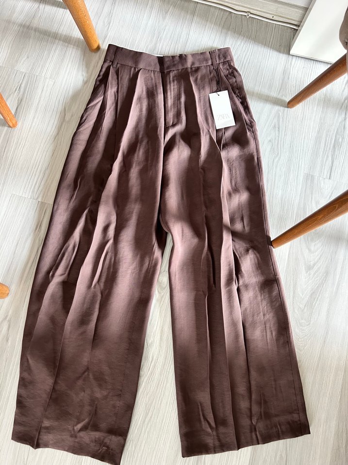 Kadın kahverengi, pile detaylı midi pantolon. Salaş kesim ve ipeksi kumaşla günlük kullanıma uygun minimal stil sunar.