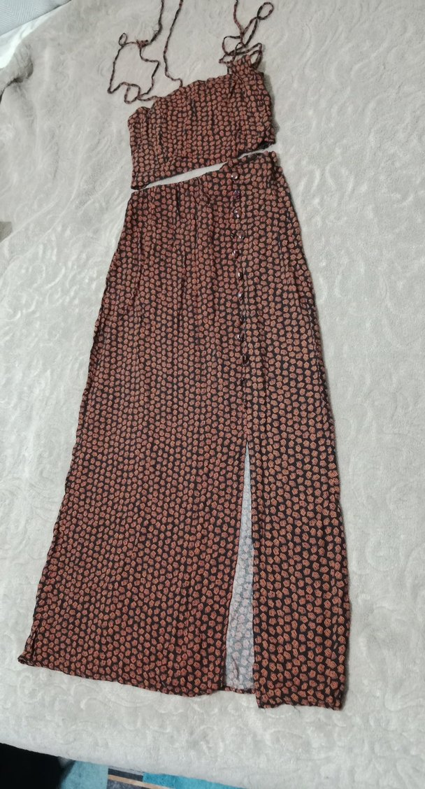 Kadınlar için kahverengi pileli uzun etek, bol kesim ve bağlama desenli, bohem tarzını yansıtır. Sentetik kumaştan üretilmiş, günlük kullanıma uygundur.
