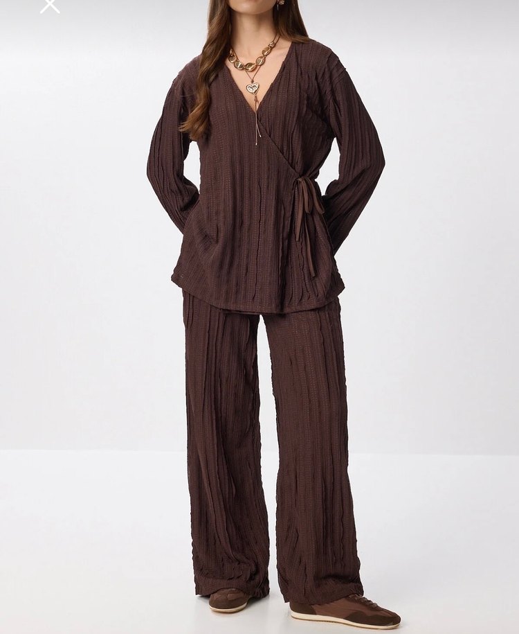 Bol kesim, uzun kahverengi keten pilili takım. Günlük kullanım için rahat.s-m beden etiketli ürün