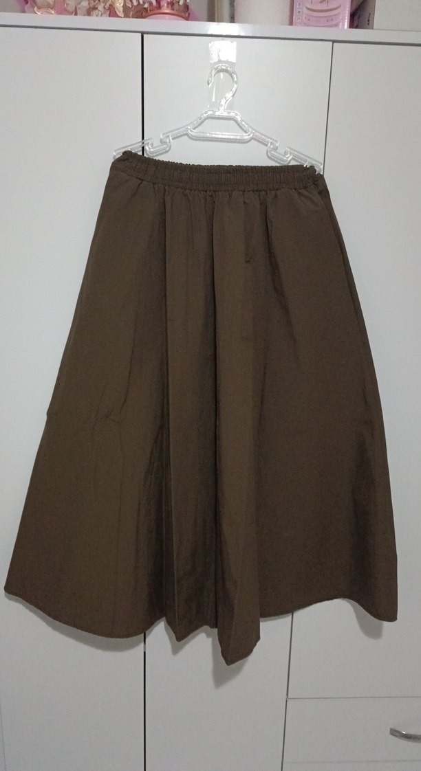 Kadınlar için kahverengi, keten kumaştan, pilili ve bol kesim midi etek. Minimalist ve normcore tarzıyla günlük kullanıma uygundur.