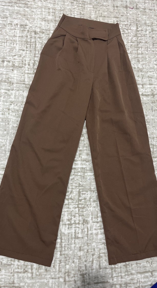 Kadın kahverengi kumaş pantolon, regular fit ve midi boydadır. Pilili ve parlak sentetik kumaştan üretilmiştir, minimalist sokak stiline uygundur. ✨ kullanılmadı
