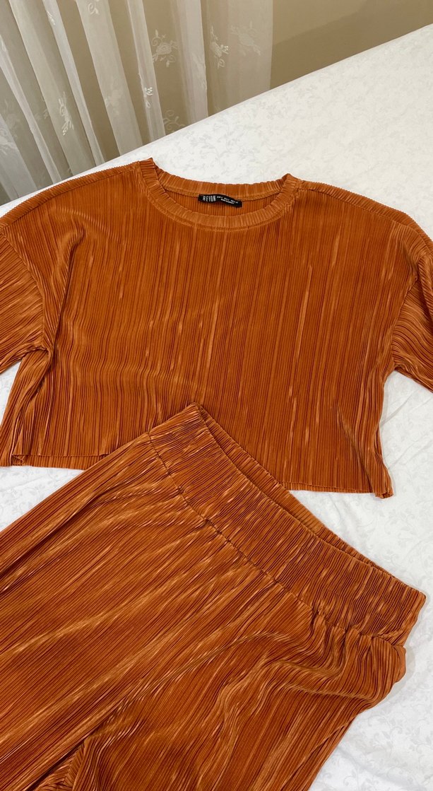 Kadınlar için pilili kahverengi parlak sentetik kumaştan eşofman takımı. Bol kesim, uzun kollu ve yuvarlak yaka tasarımıyla günlük kullanıma uygundur. 1 kere giyildi tertemiz defosu yok