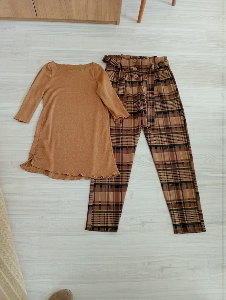 Kadınlar için kahverengi, pilili, bol kesim ve normal boyda sentetik kumaş pantolon. Günlük kullanıma uygun rahat stil.