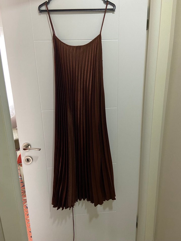 Kadın Kahverengi Pilili Uzun askılı elbise mango