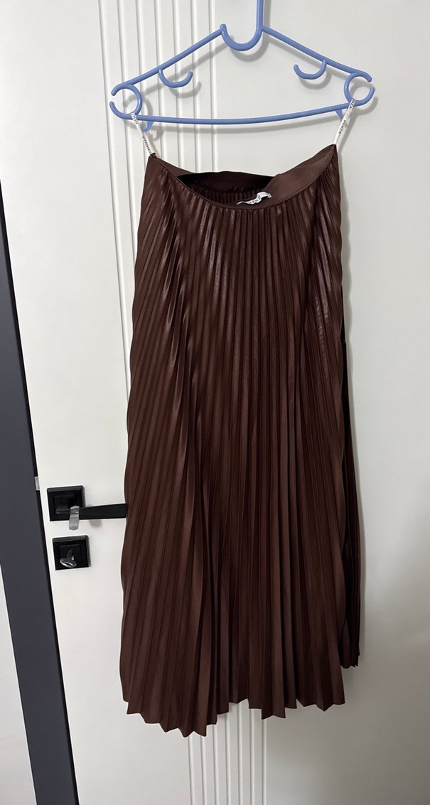 Kadınlar için kahverengi pilili uzun etek, sentetik kumaştan ve bol kesimlidir. Günlük kullanım için Paris sokak modası tarzında uygundur.