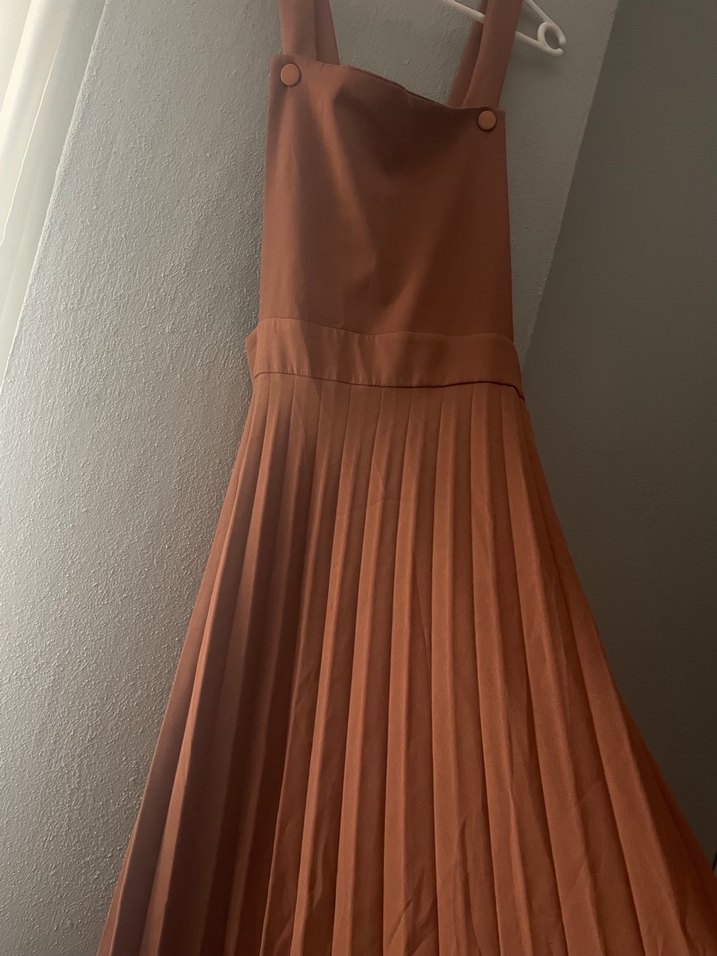 Kadın kahverengi uzun Jile elbise, pilili etek ve askılı yakaya sahiptir. Düz, klasik tarzda, rahat kesim ve sentetik kumaştan üretilmiştir.