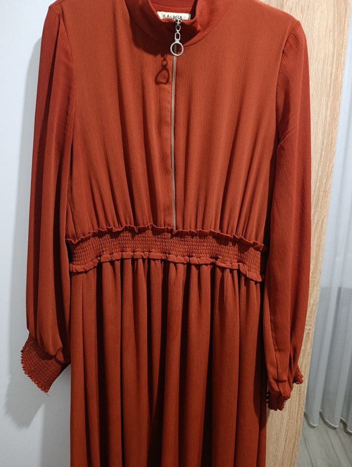 Kahverengi uzun elbise, pilili detaylar, yüksek yakalı ve uzun kollu tasarıma sahiptir. Parlak sentetik kumaştan üretilmiş, bol kesimdir.