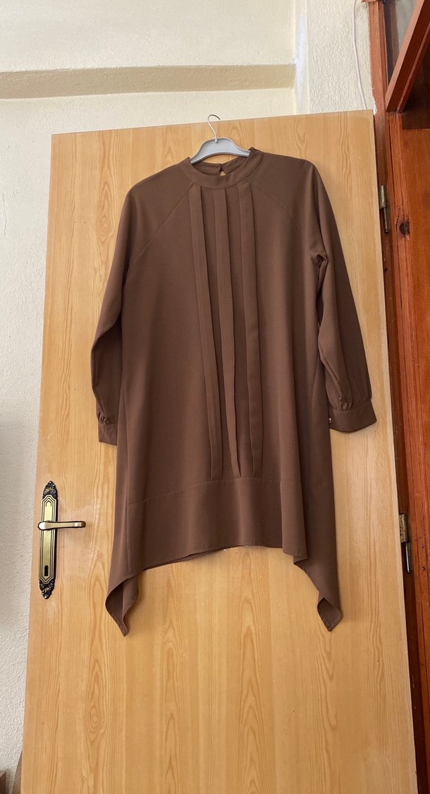Kadınlar için kahverengi, yüksek yakalı, pilili ön detaylı, uzun kollu, ipeksi kumaştan, düzenli kesim ve uzun boy tunik. Minimalist ve sade tarz için uygundur.