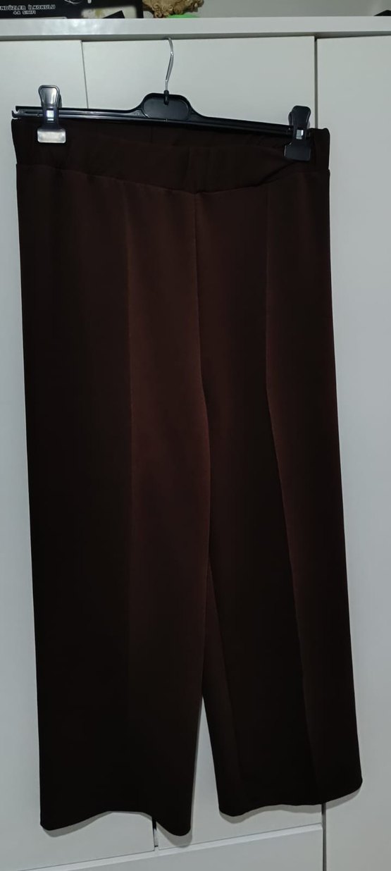 Kadın kahverengi pantolon, ipeksi kumaş ve pilili detaylara sahiptir. Düzenli kesim ile ofis kullanımı için uygundur. Minimalist ve çağdaş tarzda. her beden mevcuttur