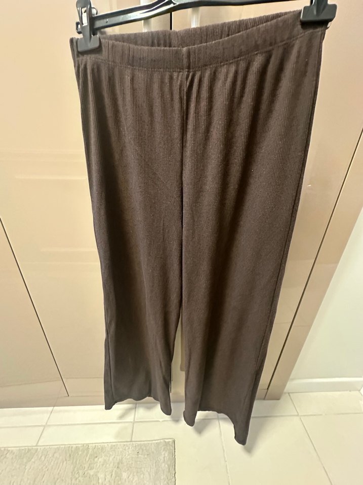 Kadın kahverengi uzun bol kesim piliseli kumaş pantolon, yumuşak sentetik kumaştan üretilmiş, rahat ve şık bir görünüm sunar. Sıfır ürün