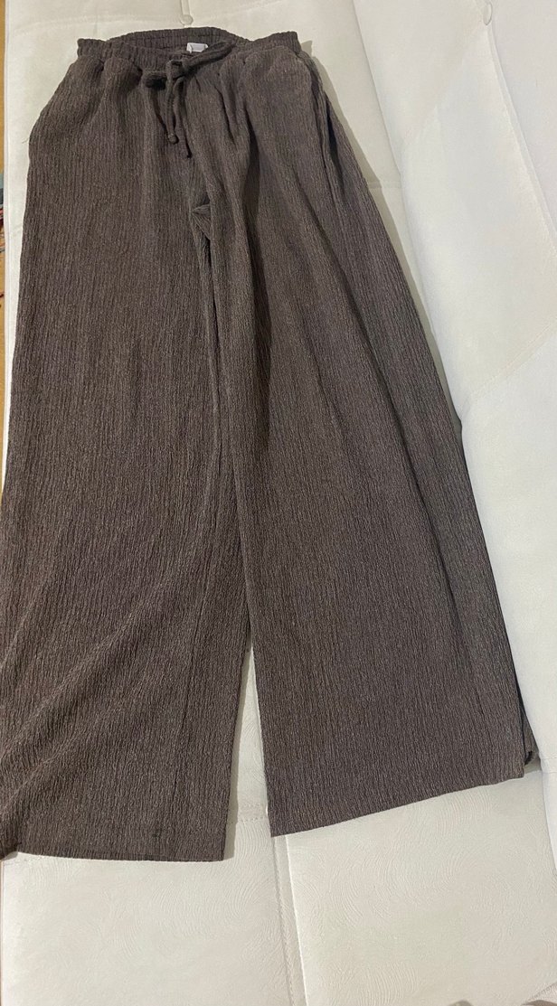 Kadınlar için kahverengi, piliseli pantolon. Bol kesim ve uzun boyuyla rahat ve şık, günlük kullanıma uygundur.