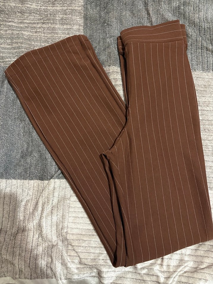 Kadın kahverengi kumaş pantolon, piliseli detaylı ve normal boyda. Rahat kesimi ve yumuşak sentetik kumaşıyla ofis ve günlük kullanıma uygundur.