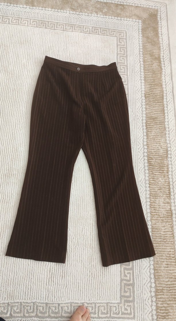 Kahverengi midi boy, piliseli kumaş pantolon. Normal kesim, ofis için uygun, koyu tonda sentetik kumaştan, trend sokak stiline uygun.