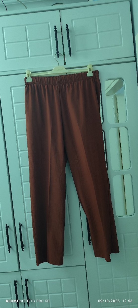 Kadın Kiremit rengi kumaş pantolon, regular fit ve midi boyda, piliseli detaylara sahip. Yumuşak sentetik kumaştan yapılmış, günlük rahat kullanıma uygun.