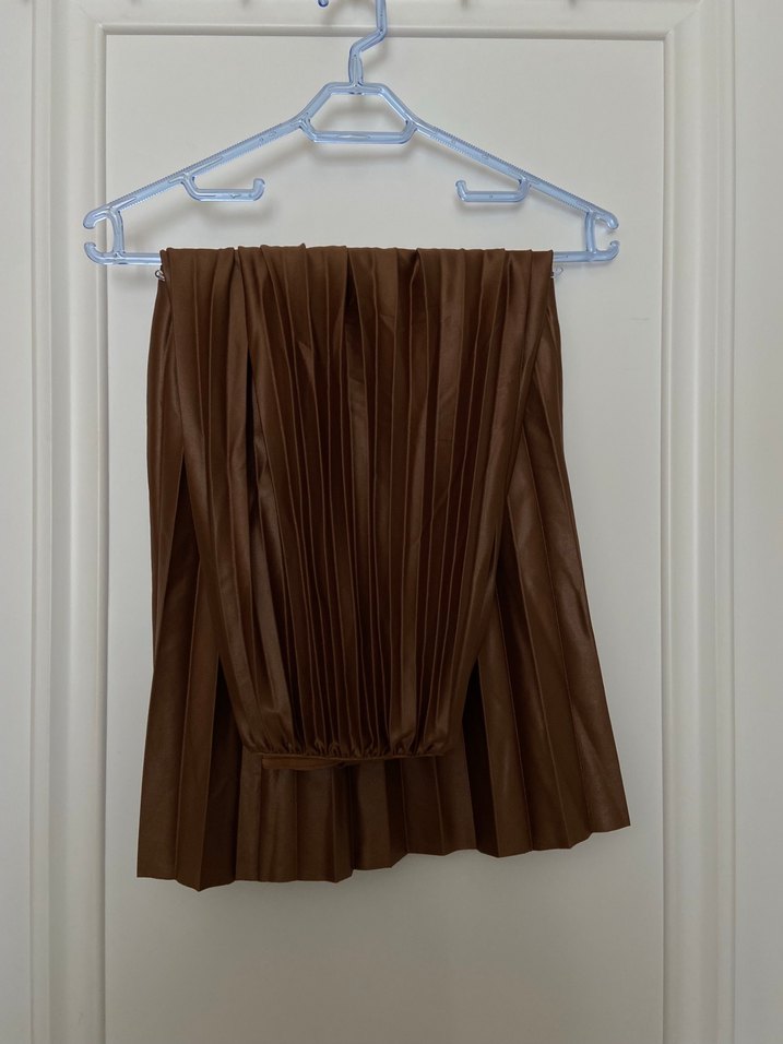 Kahverengi, piliseli ve bol kesim midi etek. Sentetik kumaştan, minimalist ve normcore tarzlara uygun, günlük kullanıma ideal.