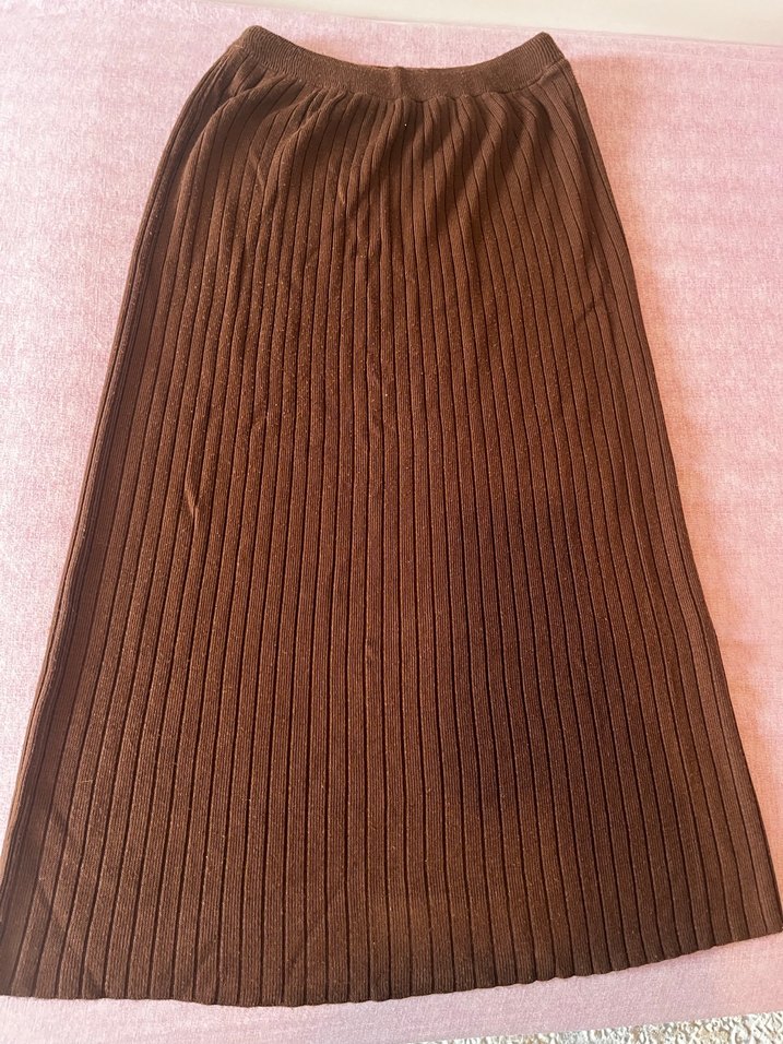 Kahverengi piliseli midi etek, yumuşak sentetik kumaştan, rahat ve sade normcore tarzıyla günlük kullanıma uygun.
