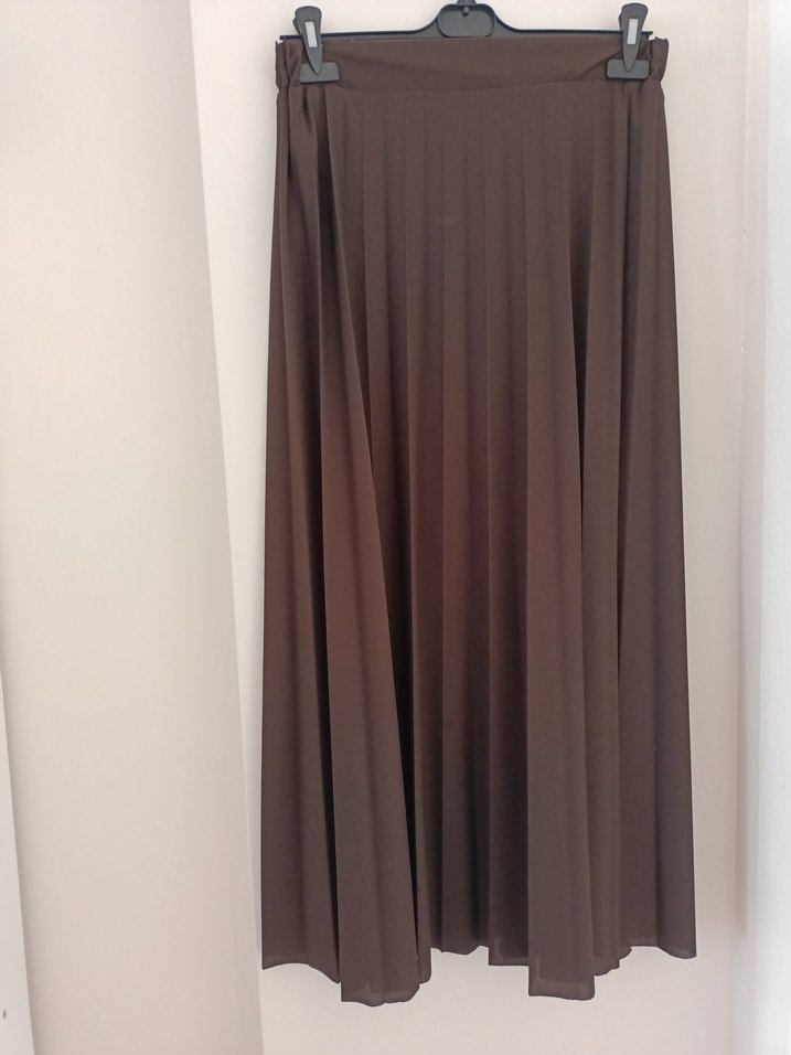 Kadınlar için kahverengi, piliseli ve bol kesim uzun etek. Pürüzsüz sentetik kumaştan, ofis kullanımı için minimalist tarzda uygun. En son görselde iç astarinin boyutu ve rengi görünmektedir.