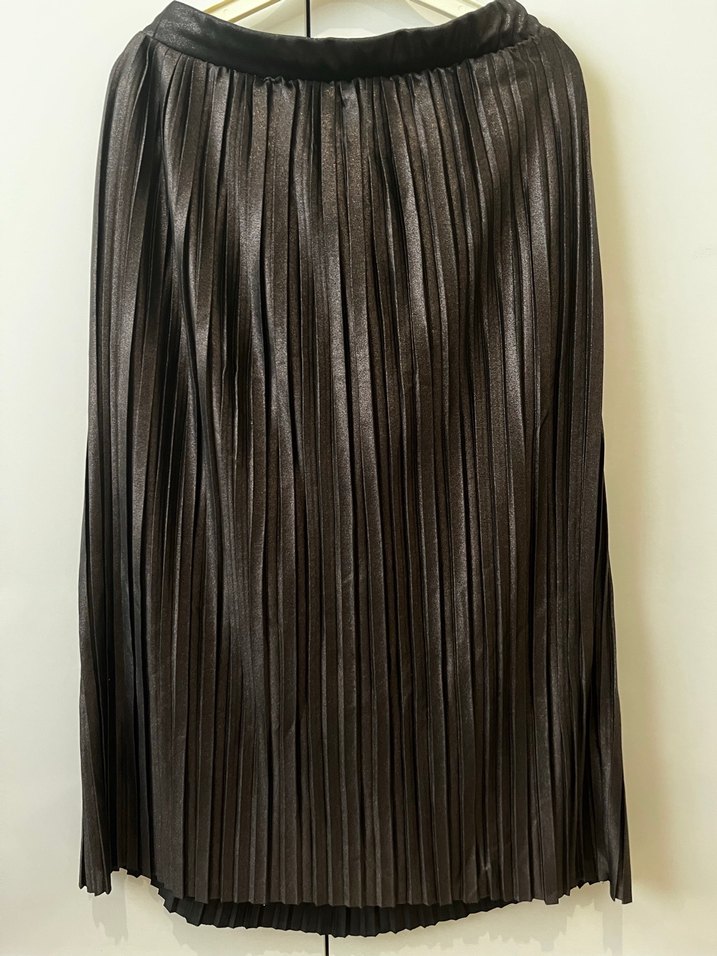 Sentetik kumaştan yapılmış, kahverengi tonlarında, piliseli ve dar kesim uzun etek. Gotik ve avangart tarzlara uygun, ofis kullanımı için ideal.