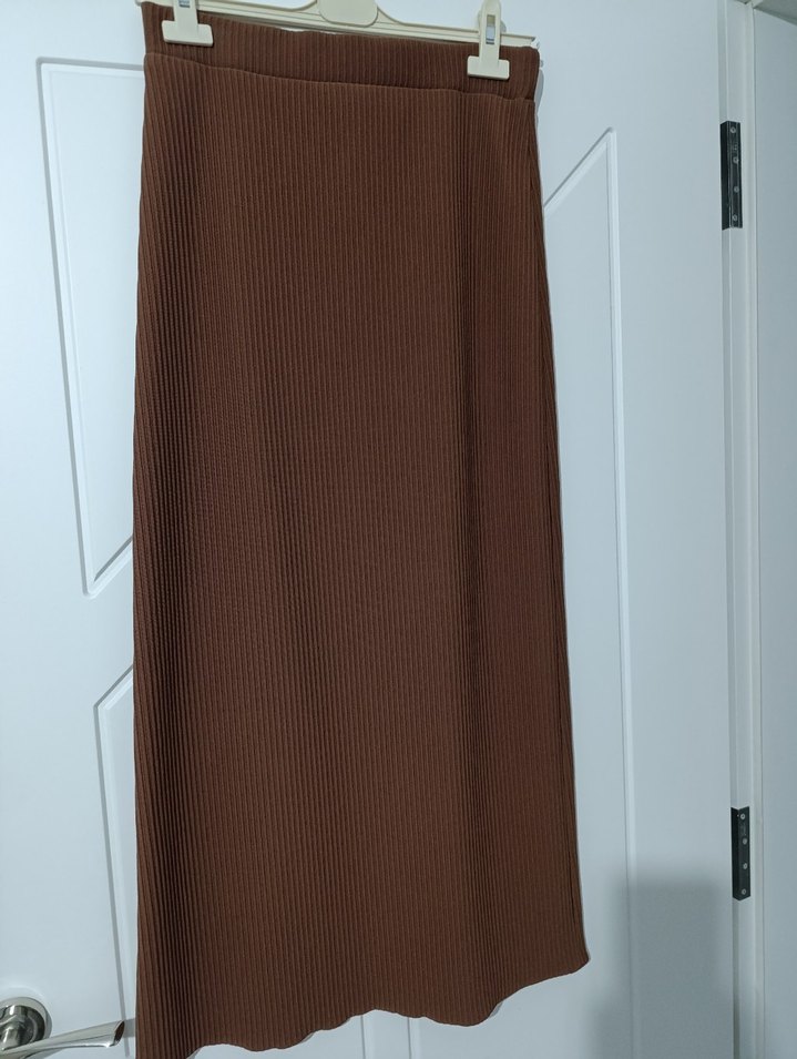 Kadınlar için kahverengi, piliseli uzun etek. Düz kesim, sentetik yumuşak kumaştan, minimalist ve desensiz tasarıma sahip, günlük kullanıma uygun.