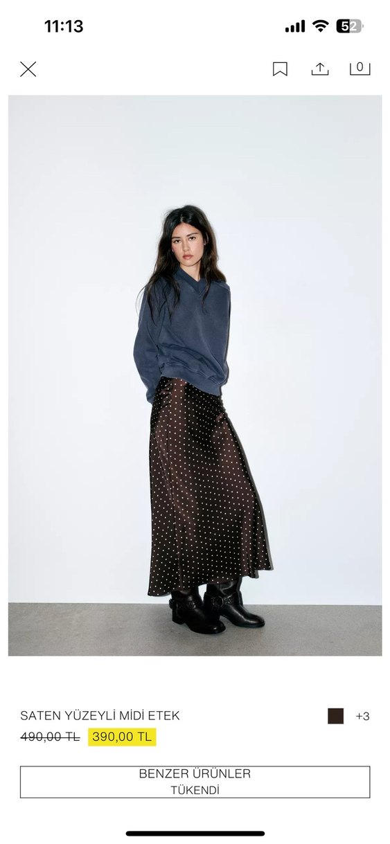 Kahverengi puantiyeli denim midi etek, rahat kesimi ve günlük kullanıma uygun şık görünümüyle dikkat çekiyor.