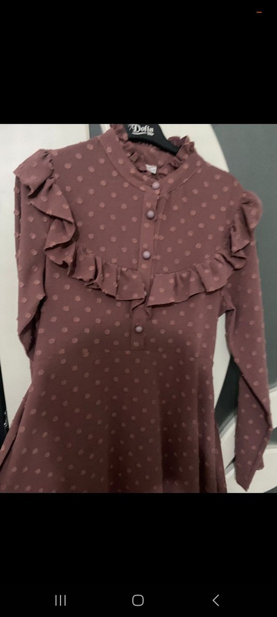 Kahverengi uzun elbise, V yaka ve uzun kollu, fırfır detaylı ve puantiyeli vintage bohem tarzında. Sentetik kumaştan, bol kesim ve günlük şıklık için uygun.