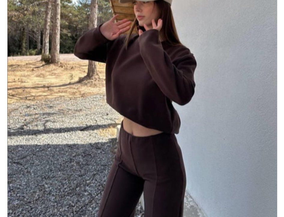 Kadın kahverengi rahat kesim eşofman takımı, midi boy, yuvarlak yaka ve uzun kollu. Yumuşak ve sıcak kumaştan, gündelik kullanıma uygun şık bir sokak stili sunar. ♀️Selanik kumaştır