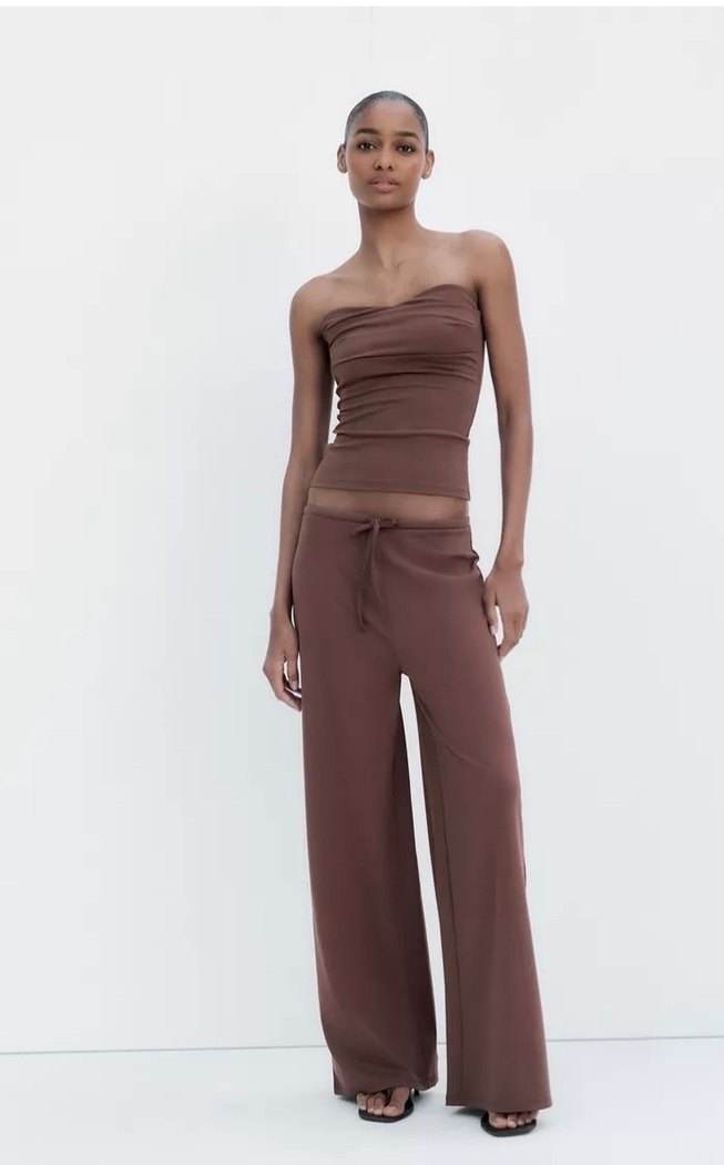 Kahverengi kumaş pantolon, rahat kesim ve midi boy. İpeksi dokusu ve desen içermeyen koyu rengiyle günlük kullanıma uygun, çağdaş ve zahmetsiz şıklık sunar. ✨