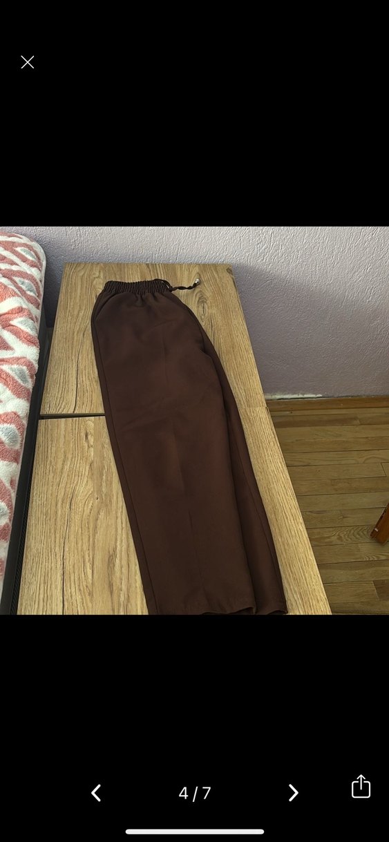 Kadın kahverengi kumaş pantolon, rahat kesim ve uzun boy. Düz, minimalist tarzda, elastik bel bandıyla günlük sokak stili için uygundur.