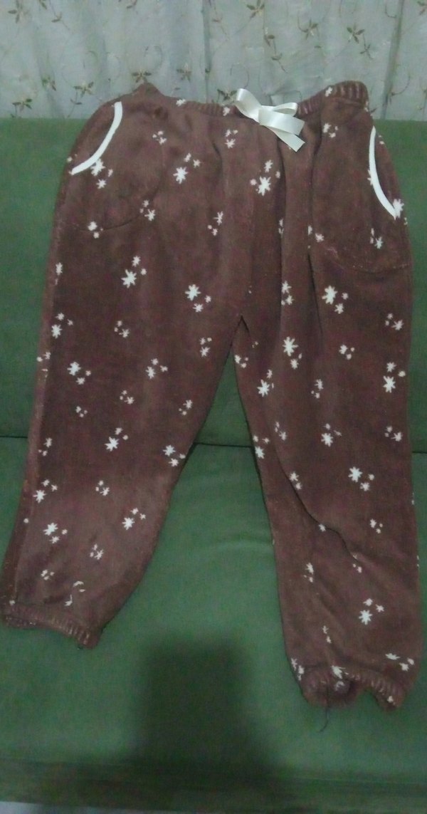 Kadın için rahat kesim, elastik bel bantlı, yumuşak kumaştan, koyu kahverengi ve hafif çiçek desenli pantolon. Sokak stili için uygun.